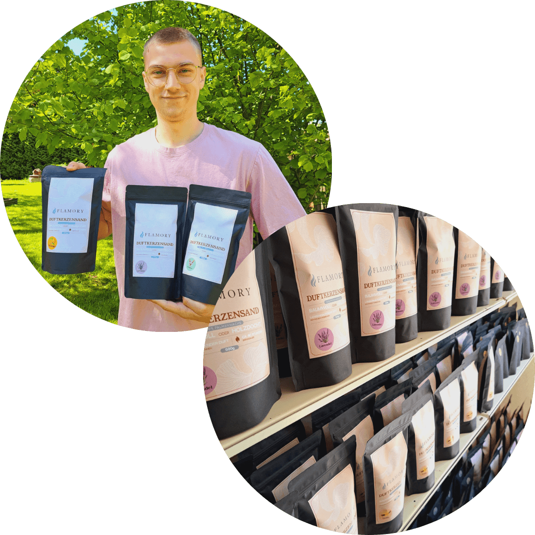 Hi, ich bin Farin und ich stecke hinter Flamory. Der Duftkerzensand wird in der Slowakei hergestellt und anschließend bei mir in einer kleinen, umgebauten Küche umgefüllt und verpackt. Ich kümmere mich um jeden Schritt persönlich, damit dein Duftkerzensand in bester Qualität bei dir ankommt.